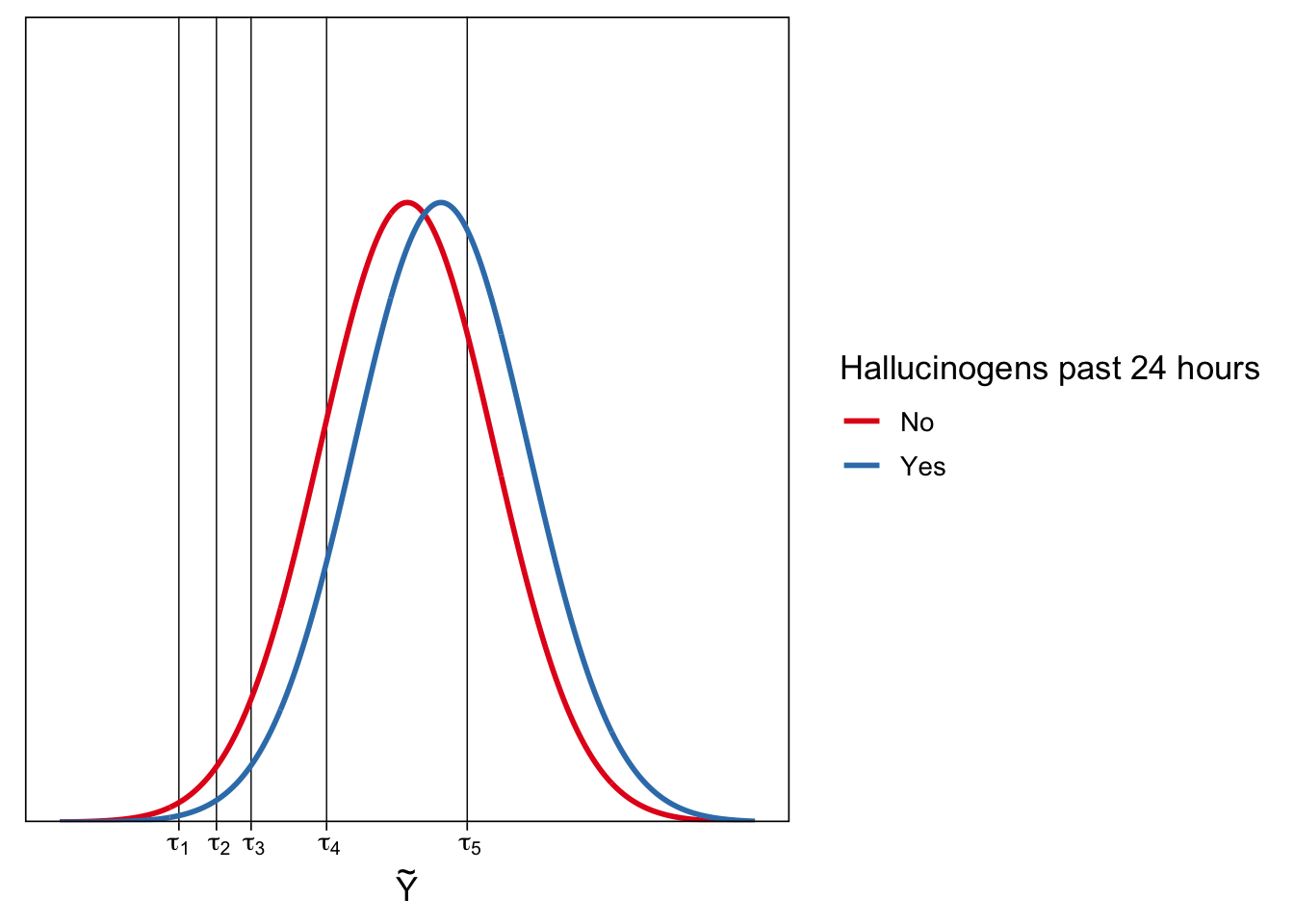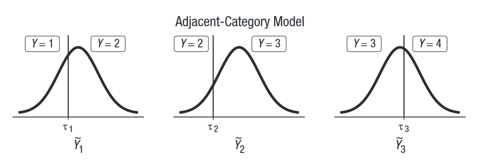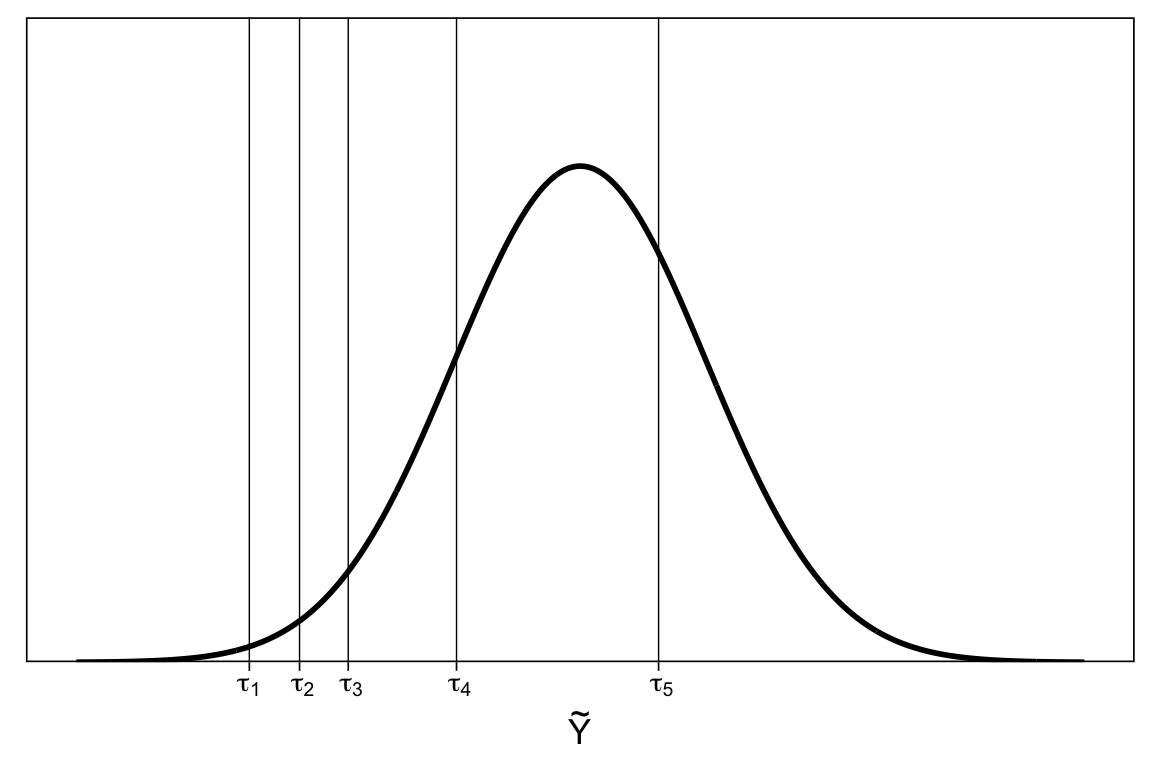 CM assumes that the observed categorical variable \(Y\) is based on the categorization of an unobserved (“latent”) variable \(\tilde{Y}\) with \(K\) thresholds \(\tau = (\tau_1, \dots, \tau_k)\).