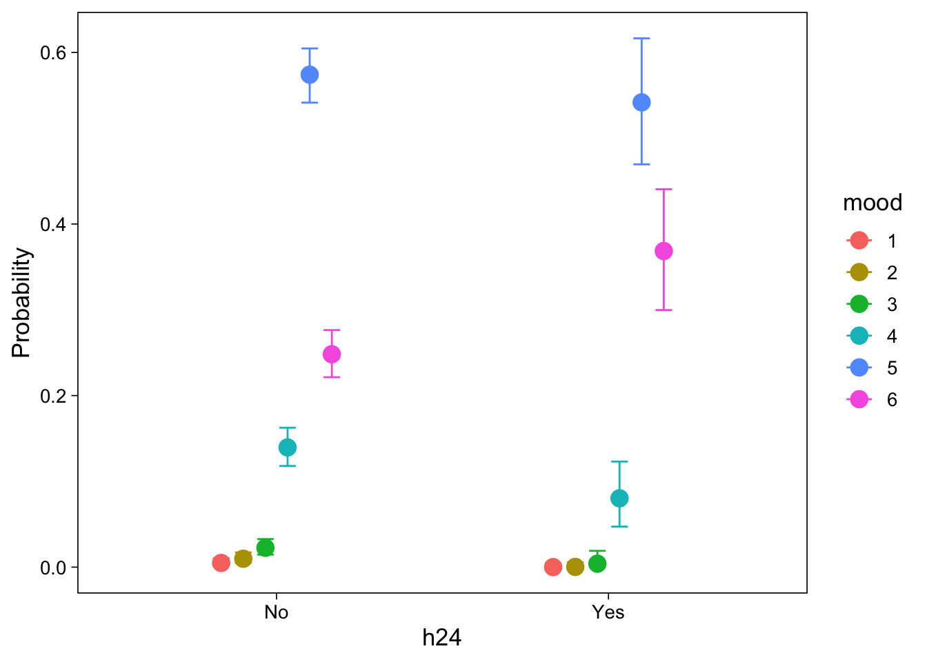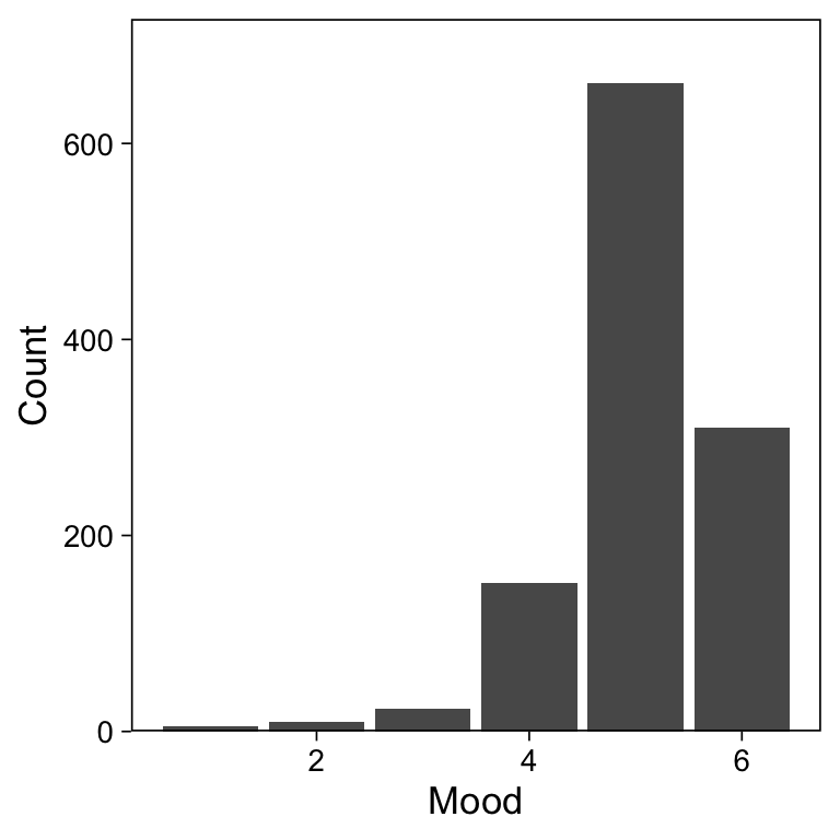 The mood rating item, \(Y\), had \(K + 1 = 6\) categories \(1, 2, ..., 6\)